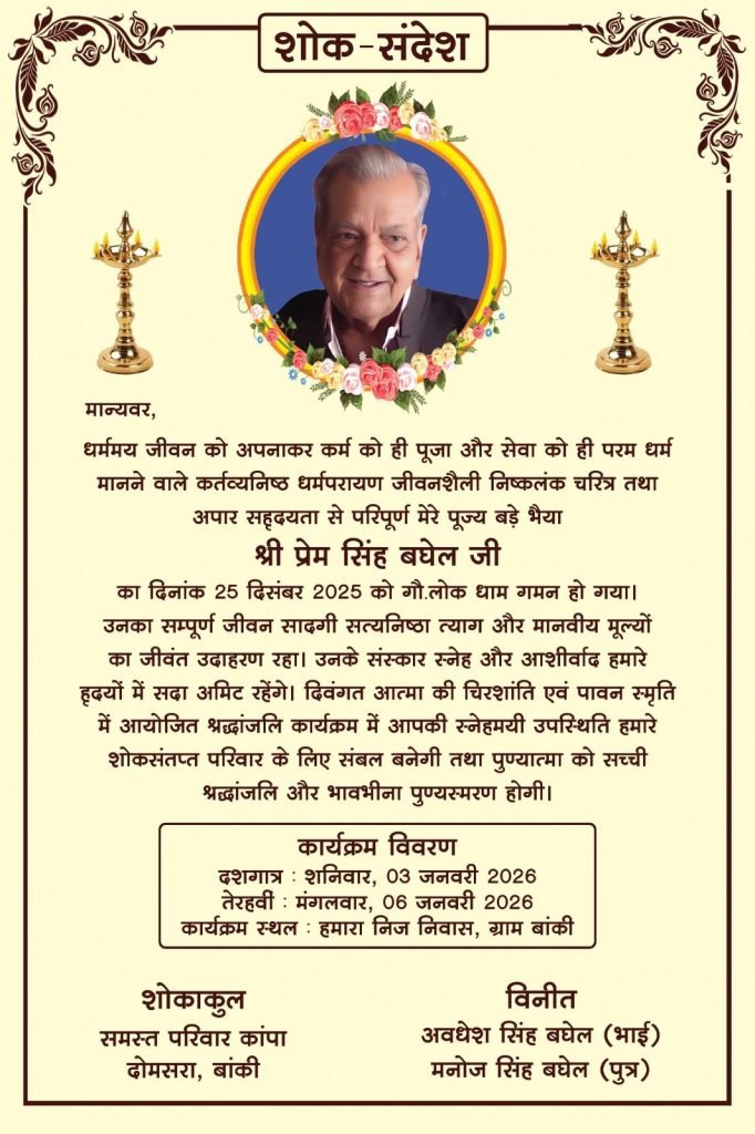 श्रद्धांजलि संदेश में परिवारजनों ने कहा कि स्व. श्री प्रेम सिंह बघेल का जीवन सादगी,अपार सहृदयता और धर्ममय आचरण से परिपूर्ण रहा। उनके संस्कार, स्नेह और आशीर्वाद सदैव परिवारजनों के हृदयों में अमिट रहेंगे। दिवंगत आत्मा की चिरशांति एवं पावन स्मृति में आयोजित इस श्रद्धांजलि कार्यक्रम में उपस्थित सभी शुभचिंतकों की स्नेहमयी सहभागिता शोकसंतप्त परिवार के लिए संबल बनी।