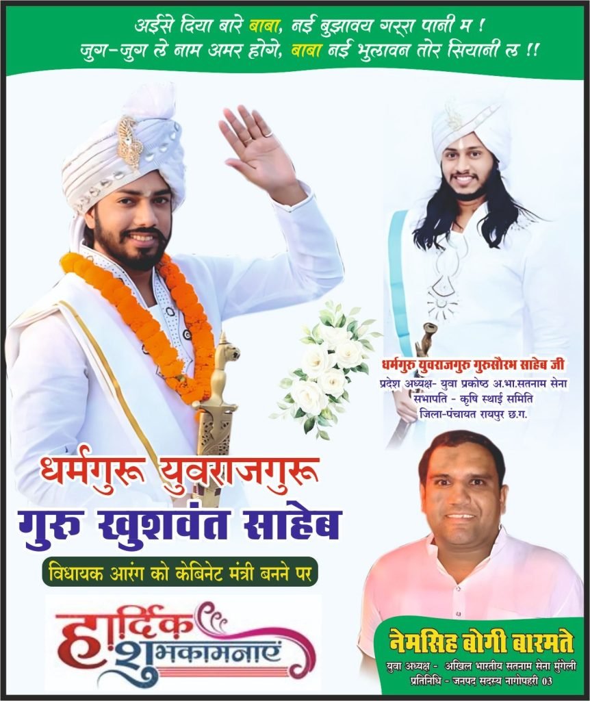 अखिल भारतीय सतनाम सेना,मुंगेली के युवा जिला अध्यक्ष नेमसिंह बोगी बारमते ने गुरु खुशवंत साहेब को कैबिनेट मंत्री पद की शपथ ग्रहण करने पर हार्दिक शुभकामनाएँ एवं बधाई प्रेषित की है। उन्होंने कहा कि गुरु खुशवंत साहेब जी के मंत्री बनने से समाज एवं प्रदेश की प्रगति को नई दिशा मिलेगी। साथ ही उन्होंने विश्वास जताया कि गुरु जी सदैव जनसेवा और समाजहित के कार्यों में अग्रणी रहेंगे।
