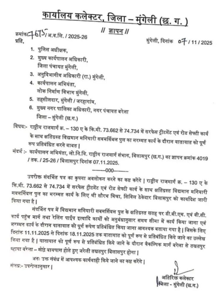 मुंगेली/तखतपुर,राष्ट्रीय राजमार्ग क्रमांक 130A पर स्थित किलोमीटर 73.662 से 74.734 के बीच मनियारी पुल पर मरम्मत एवं सड़क सुरक्षा (सेफ्टी) संबंधी महत्वपूर्ण कार्य होने जा रहा है। इस कारण मार्ग को कुछ दिनों के लिए पूरी तरह बंद रखा जाएगा। जिला कलेक्टर कार्यालय, मुंगेली द्वारा इस संबंध में आधिकारिक आदेश जारी कर दिया गया है।