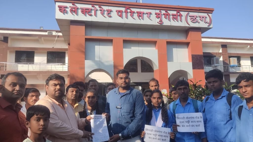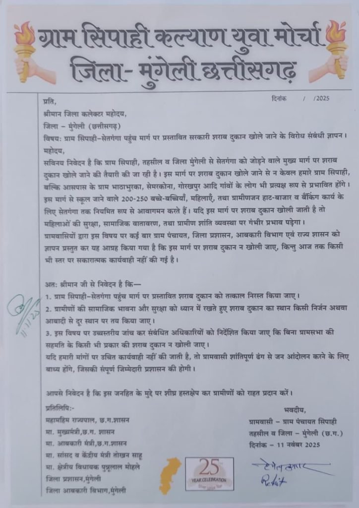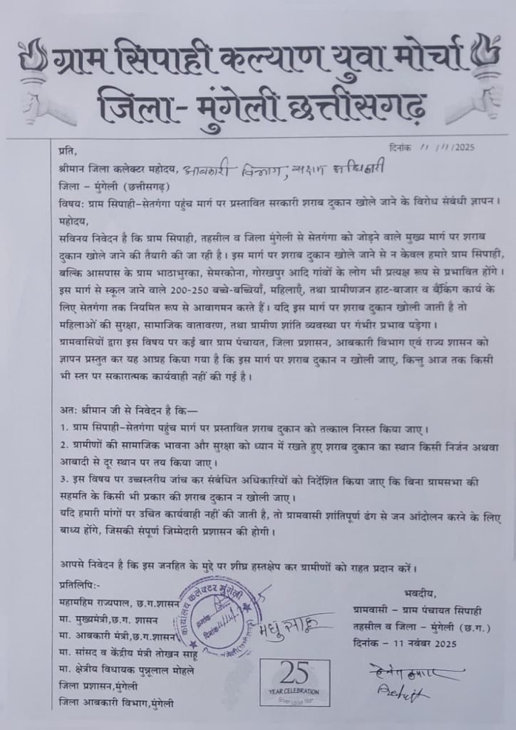 मुंगेली/जिले के ग्राम सिपाही–सेतगंगा मार्ग पर प्रस्तावित सरकारी शराब दुकान खोले जाने के विरोध में ग्रामीणों का आक्रोश लगातार बढ़ता जा रहा है। ग्राम सिपाही कल्याण युवा मोर्चा के नेतृत्व में बुधवार को सैकड़ों ग्रामीणों, महिलाओं और स्कूली बच्चों ने जिला कलेक्टर,आबकारी अधिकारी सहित अन्य संबंधित अधिकारियों को एक ज्ञापन सौंपकर दुकान खोलने के निर्णय को तत्काल निरस्त करने की मांग की।