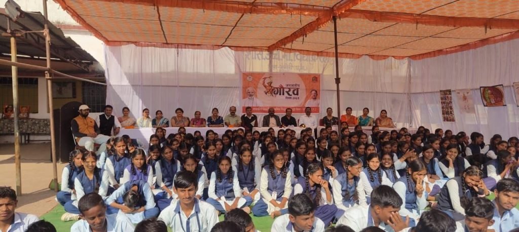 कार्यक्रम की शुरुआत माँ सरस्वती और जनजातीय स्वतंत्रता सेनानी भगवान बिरसा मुंडा की पूजा-अर्चना से की गई। विद्यालय के विद्यार्थियों ने स्वागत गीत प्रस्तुत कर अतिथियों का अभिनंदन किया। शाला के प्राचार्य जे. एस. ध्रुव ने जिलाशिक्षाधिकारी एवं डीएमसी का शाल एवं श्रीफल देकर सम्मान किया।