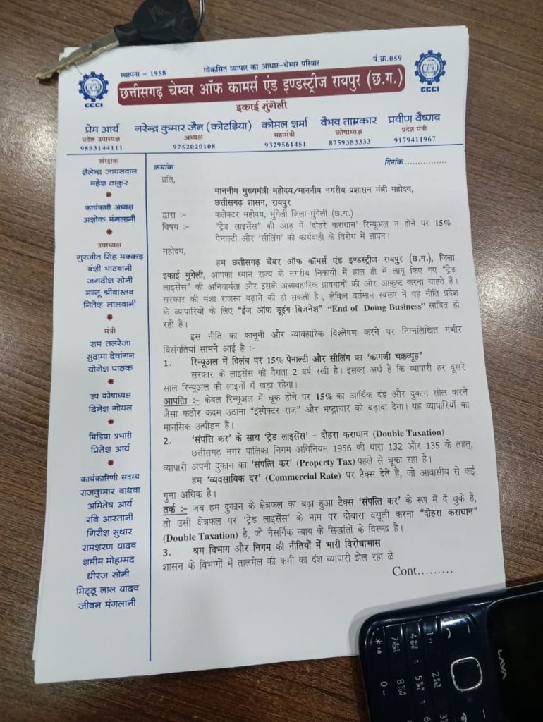 मुंगेली/छत्तीसगढ़ चेम्बर ऑफ कॉमर्स एंड इंडस्ट्रीज की मुंगेली इकाई द्वारा जिले के कलेक्टर कुंदन कुमार को मुख्यमंत्री एवं नगरीय प्रशासन मंत्री के नाम एक ज्ञापन सौंपा गया। ज्ञापन के माध्यम से हाल ही में लागू की गई ट्रेड लाइसेंस की अनिवार्यता का तीखा विरोध करते हुए इसे तत्काल प्रभाव से वापस लेने की मांग की गई।